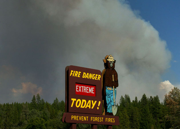 Smokey the Bear in Buck Meadows, Ca, with the Rim Fire burning behind him and his sign. On August 20, the fire was 10,000 acres.Marty Bicek/ZUMA