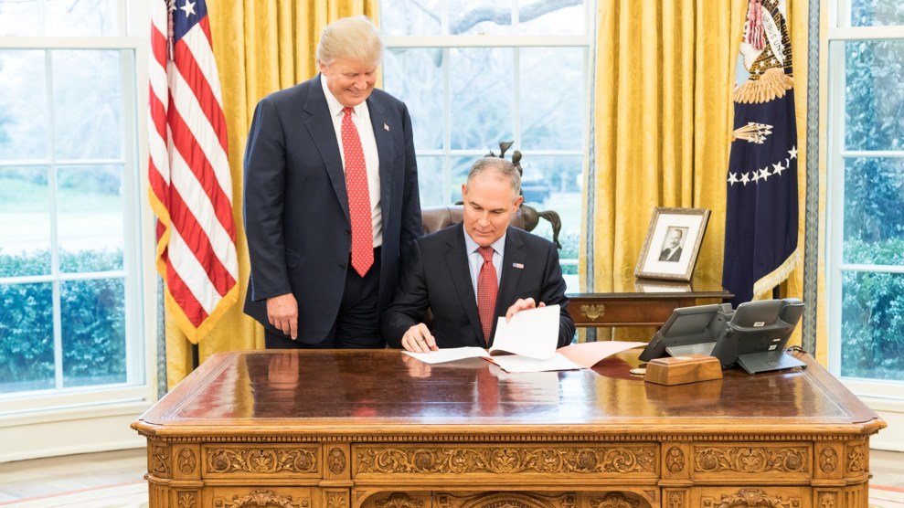 In an administration full of deregulators, Pruitt stands out, bringing to the EPA the anti-Washington playbook he developed with industry in Oklahoma. In December 2017, the White House trumpeted presidential accomplishments from Trump’s first year—a list dominated by handouts to the energy industry. Pruitt’s fingerprints were everywhere, from “exiting the Paris climate agreement” to “ending the war on coal.” It’s an agenda that taps directly into the right-wing populism that was integral to Trump’s success—and a corporate donor base that will be vital to Pruitt’s future.