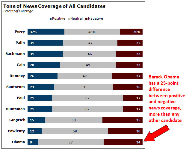One man running for president has suffered the most unrelentingly negative treatment of all, the study found: Barack Obama. Though covered largely as president rather than a candidate, negative assessments of Obama have outweighed positive by a ratio of almost 4-1. Those assessments of the president have also been substantially more negative than positive every one of the 23 weeks studied. And in no week during these five months was more than 10% of the coverage about the president positive in tone.
