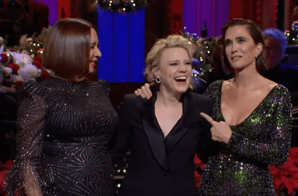 Before the rest of the show got underway, McKinnon sang (altered) Christmas carols about going “home for Christmas” and joked about returning to her former workplace, even flashing her original (and, by her own admission, awkward) NBC ID badge from her first days on SNL, back in 2012. Her former cast mates Maya Rudolph and Kristen Wiig also made surprise appearances during her monologue.