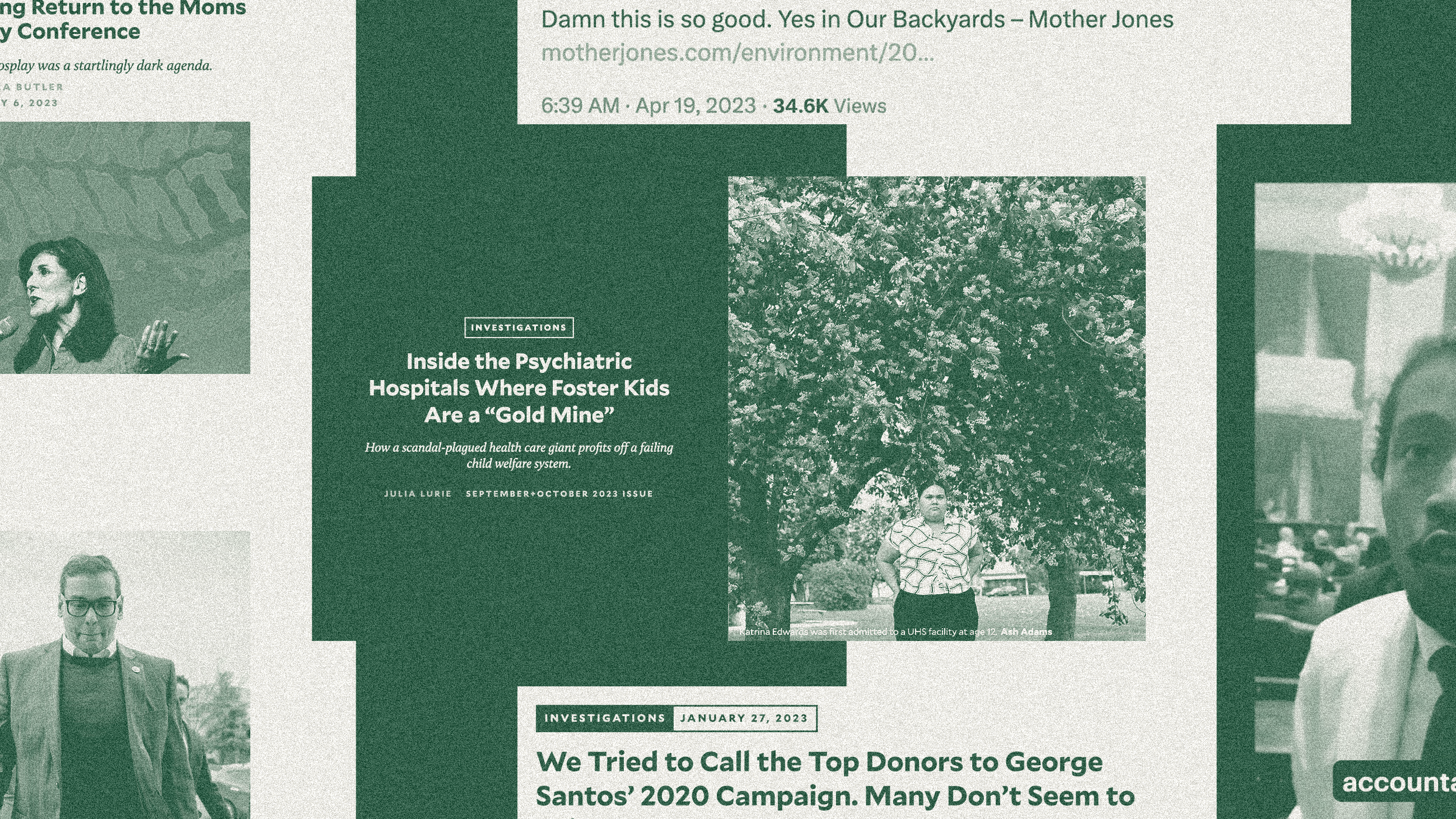 If impact is the name of the game in journalism (spoiler: it is), then Mother Jones continues to be a major player. Our journalism contributed to the expulsion of a corrupt congressman, exposed anti-democracy political groups and corporate greed, and helped provide the basis for a Senate investigation. We launched a creator-in-residence program that helped us reach new audiences in new places. Most importantly, thanks to your support, our journalism made a difference in the lives of our subjects, sources, and readers. Here is a look back at a few of the most powerful stories of 2023: