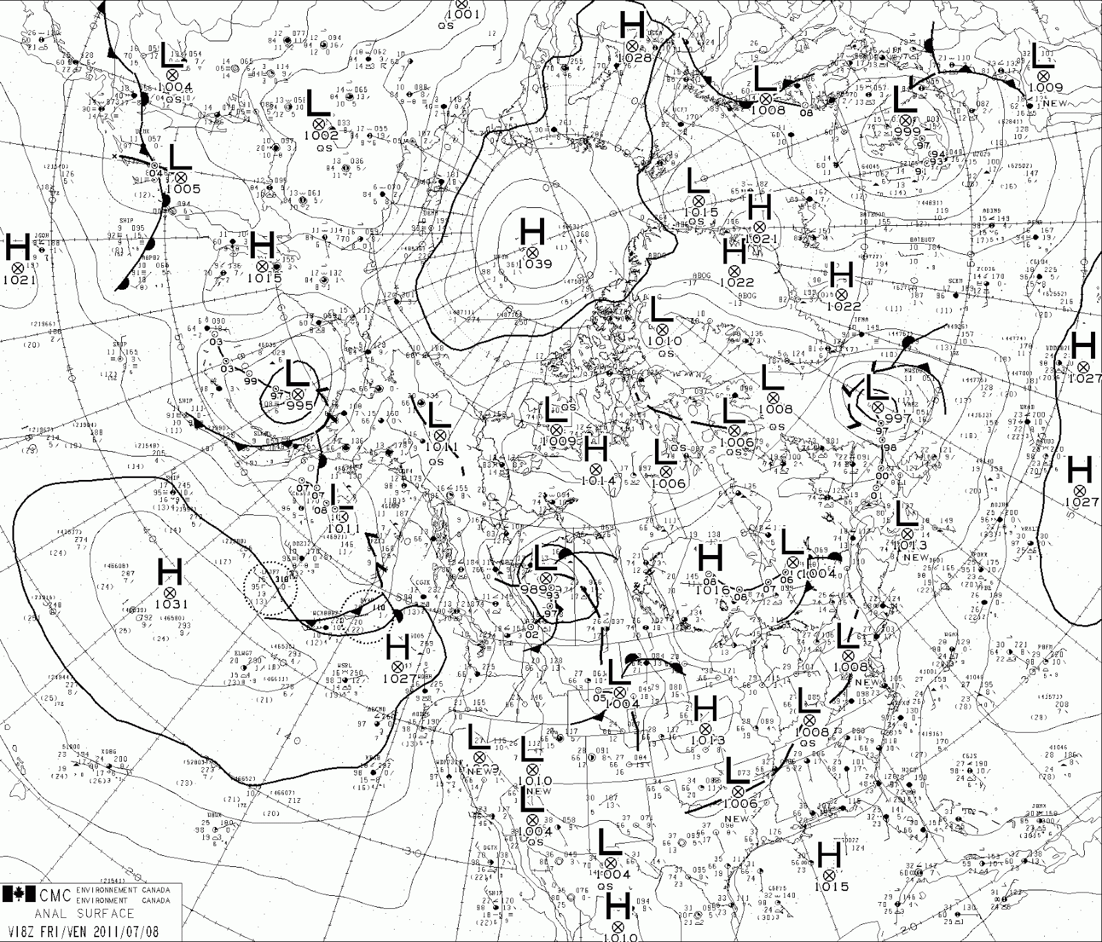 The latest surface analysis from Environment Canada shows a 1039 mb high pressure system centered north of Alaska, which is bringing clear skies and plenty of ice-melting sunshine to the Arctic. The combined action of the clockwise flow of air around the high and counter-clockwise flow of air around a low pressure system near the western coast of Siberia is driving warm, southerly winds into the Arctic that is pushing ice away from the coast of Siberia, encouraging further melting. This pressure pattern, known as the Arctic Dipole, was dominant over the Arctic during June, leading to June having the 2nd lowest extent on record, and the record low extent observed at the beginning of July. The Arctic Dipole began emerging in the late 1990s, and was unknown before then; thus climate change is suspected as its primary cause. The Arctic Dipole has become increasingly common in the last six years, and has contributed significantly to the record retreat of Arctic sea ice.