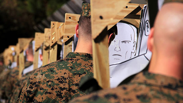 US Marines patch up holes after close-range shooting practice. (US Marine Corps photo by Sgt. Timothy Parish)